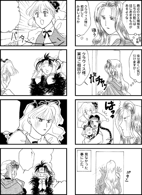 なんじゃこのネタ。 左側のは、読み返したらなんだか面白くなかったので台詞だけ消してみました。 色々想像して遊んで読んだ方が、私が書いたのよりきっと面白いです。 でも多分誰でも想像つくようなくだらないコト書いてます。 ちなみにこのネタじゃさっぱりわからないけどワタシはゼフェルもえ。
