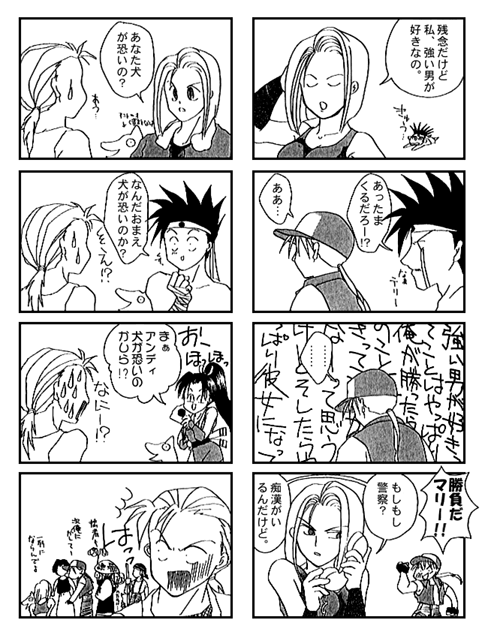 餓狼3。ブルーマリー初登場の作品ですね。 こうして見ると当時からテリー×マリーは王道だったんだなぁとか。 ちなみにこれは妄想ですが、 当時マリーの設定(うろ覚えですが、両親が格闘家で祖父がギースに殺されたとかそんな)を読んで 「マリーはリョウとキングの娘に違いない。そしてタクマはギースに殺されるに違いない。」 とかかってに思ってました。 だってトランクスだってべジータとブルマの子供だったじゃん。(←意味不明)